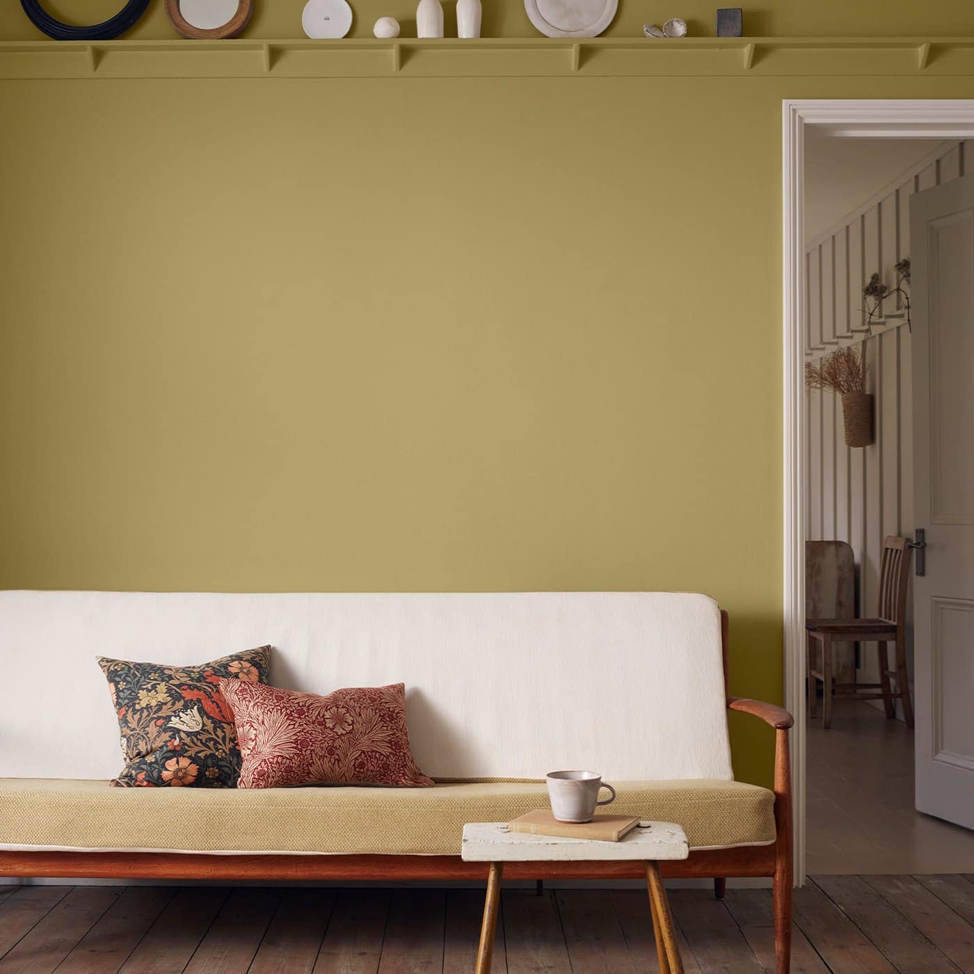 Citrus Stone introduces a brightening, mid-olive green hue into uplifting spaces, inspired by the colours and fruits used in an early Morris & Co. design, Fruit (1864).