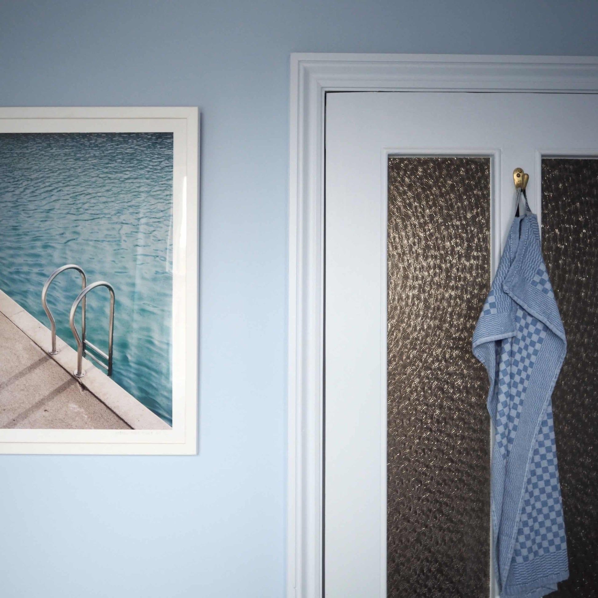 This pale blue paint has a cheerful, tranquil quality, with its light appearance creating a comforting ambience when paired with a white.